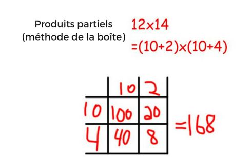 Ainsi, lorsqu’il s’agit de résoudre des problèmes de proportions, un bon nombre d’élèves trouvent plus efficace de représenter celles-ci avec des mosaïques au lieu de le faire avec des symboles. Prenons également l’exemple de la multiplication de nombres à deux chiffres. Au lieu d’enseigner l’algorithme mémorisé habituel, il vaut mieux concevoir un organisateur graphique pour enseigner l’approche des produits partiels (p. ex. la méthode de la boîte illustrée ci-dessous), car elle permet aux élèves de suivre plus facilement la procédure.