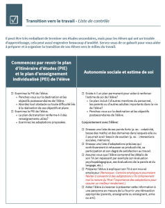 Le document Tracer son itinéraire vers la réussite constitue une ressource particulièrement importante pour les élèves ayant un TA. Ceux-ci ont avantage à planifier leur itinéraire et à y réfléchir d’avance en vue d’aplanir toute difficulté liée à une transition si importante. Dans le cas des élèves ayant un TA, la section du Plan d’enseignement individualisé (PEI) qui porte sur la transition sera également utile pour jeter les assises d’un bon plan.