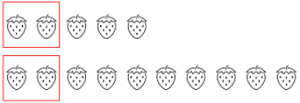 Pour soutenir son discours, l’enseignant·e peut utiliser des dessins. Or, dans la Figure 2, référer au sens « partie d’un ensemble » pour comparer 2/5 et 2/10 n’aide pas l’élève à comprendre clairement pourquoi ajouter des fraises à l’ensemble (augmenter le dénominateur) fait en sorte que la fraction est plus petite. Cependant, cette relation apparaît plus évidente lorsque la représentation « partie d’un tout » est proposée (voir Figure 3). Au début de l’apprentissage des fractions, il apparaît donc davantage pertinent d’utiliser un sens de la fraction qui soutient la compréhension conceptuelle.