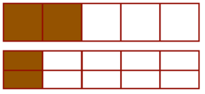c) L’enseignant·e représente encore la fraction 2/5 d’un gâteau de fête au tableau en soulignant que deux parties du gâteau séparé en cinq parties ont été mangées. L’enseignant·e questionne ensuite ses élèves : « Si ma mère souhaite diviser le gâteau en 10 parties égales plutôt que 5. Combien devrais-je manger de parties maintenant pour manger la même quantité de gâteau qu’au départ? ».