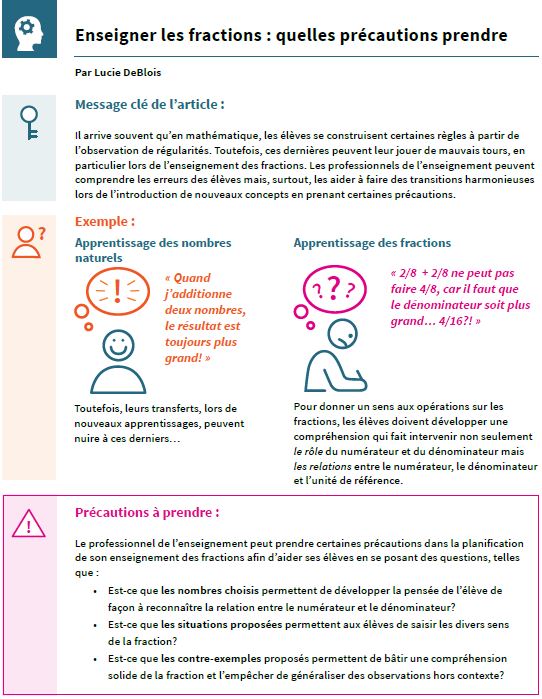 Les erreurs des élèves font partie du processus de transformation des connaissances, notamment lorsqu’on leur soumet des problèmes à résoudre plutôt que des exercices d’application (DeBlois, 1995). Dans ces conditions, la curiosité des professionnels de l’enseignement à l’égard du raisonnement de leurs élèves est essentielle pour interpréter leurs erreurs et les situer dans un processus (DeBlois, 2003). Par exemple, le pourcentage est le plus souvent présenté comme une fraction équivalente (CSFL, 2015) à l’élémentaire. Le pourcentage sera toutefois situé dans l’apprentissage du raisonnement proportionnel au secondaire qui s’appuie sur la fraction-rapport. Enfin, pour donner un sens aux opérations sur les fractions, les élèves doivent développer une compréhension qui fait intervenir non seulement le rôle du numérateur et du dénominateur mais les relations entre le numérateur, le dénominateur et l’unité de référence.