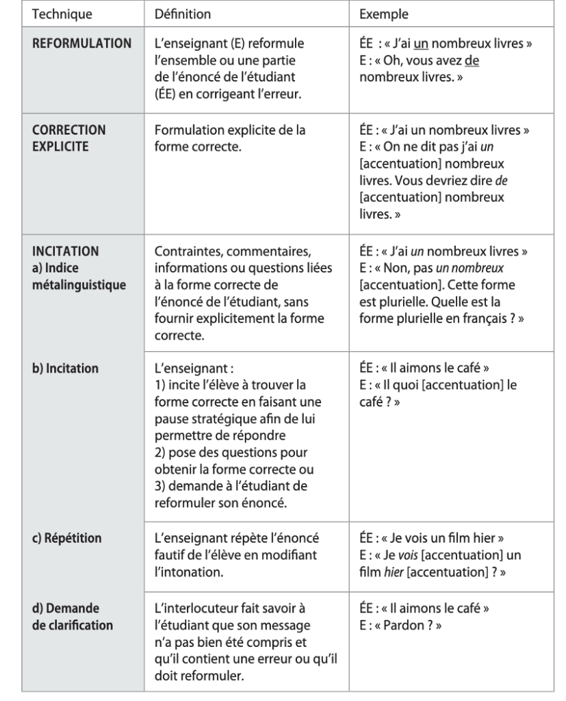 Nous proposons de les présenter, car elles nous semblent pertinentes et surtout peu intrusives dans la manière d’amener la reformulation. En effet, une rétroaction qui consisterait seulement à répéter la « bonne façon de dire » pourrait produire de l’insécurité linguistique chez les élèves et, dans ce cas, ils s’inhiberaient et n’oseraient plus prendre la parole. Il est préférable d’accompagner l’élève en reformulant ses propos sans mettre l’accent sur la forme fautive. Le tableau ci-dessous représente les différentes formes de rétroaction correctives selon Lyster et Ranta (1997 dans Kartchava, 2014).