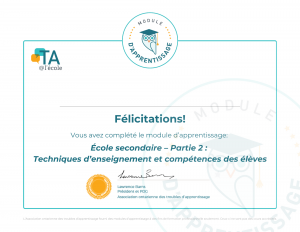 Vous avez terminé le module d’apprentissage intitulé « École secondaire – Partie 2 : Techniques d’enseignement et compétences des élèves » créé par TA@l’école.