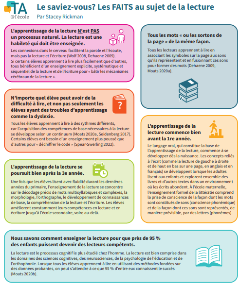 Bien que les élèves ayant des TA n’aient pas nécessairement besoin d’un programme de lecture différent, ils auront possiblement besoin d’un soutien plus important, d’un enseignement explicite et de plus de temps pour arriver à maitriser les compétences enseignées [4].
