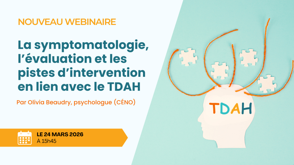 Lors de ce webinaire, les critères diagnostiques du déficit de l’attention/hyperactivité (TDAH) seront abordés. Les symptômes, caractéristiques communes et comorbidités fréquentes en lien avec le TDAH seront présentés. Lors de la présentation, la psychologue offrira des exemples de comportements observables auprès des jeunes et des adolescents ayant ce diagnostic. Les différents facteurs reliés au TDAH seront présentés. La psychologue expliquera le processus d’évaluation dans le contexte scolaire et elle présentera également des pistes d’intervention possibles en lien avec ce diagnostic.