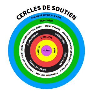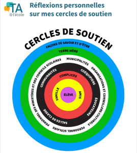 Prenez note qu’un complice dans vos cercles de soutien peut inclure de nombreuses personnes qui se trouvent dans les cercles environnants. Pour nous, ce sont les éducateurs, les administrateurs et le personnel de soutien scolaire qui avaient déjà commencé à s’investir dans leur propre apprentissage, qui ont relevé le défi et qui ont fourni un soutien indéfectible dans le but commun de « centrer les façons autochtones de faire, d’être, de penser et de savoir au cœur de leur travail ». Ils ont recherché des possibilités d’apprentissage, partagé des ressources, entretenu des relations avec la communauté et, surtout, se sont soutenus mutuellement. Je vous invite à réfléchir à ce qui suit :